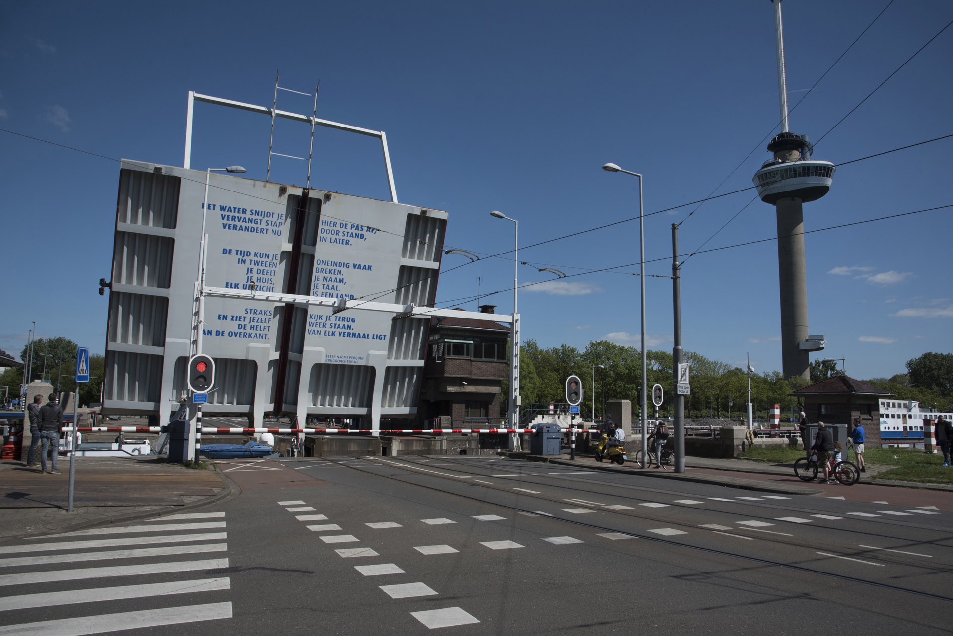 Met een nachtje vertraging startten we afgelopen zaterdag 2 mei met het aanbrengen van het bruggedicht van Ester Naomi Perquin op de Parkhavenbrug te Rotterdam. Michelle en Willem van Atelier Leo Mineur schilderden vanaf een enorme telescoophoogwerker het bruggedicht op de bruggeklep. In het holst van de nacht, hoog boven water en tegen de achtergrond van de Euromast. Er zijn minder tot de verbeelding sprekende plekken te bedenken.
